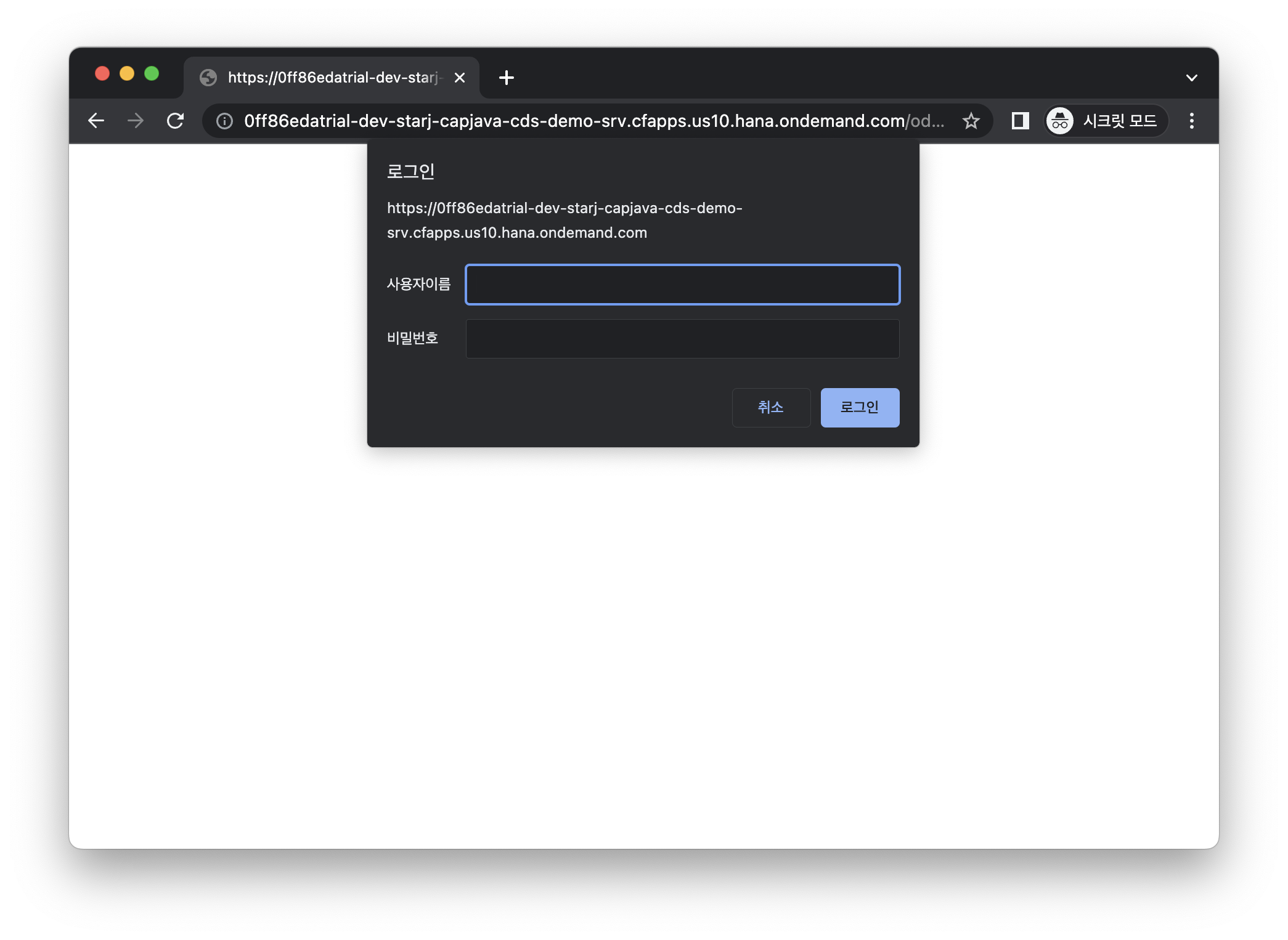 위 그림과 같이 사용자이름 및 비밀번호를 물어보는 것은 당연하며 사용자 인증이 필요 없도록 service.cds를 아래와 같이 @requires : 'any' Annotation을 추가한 후 CAP Java Application을 재 배포한다.