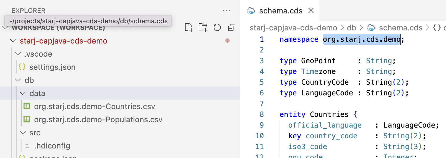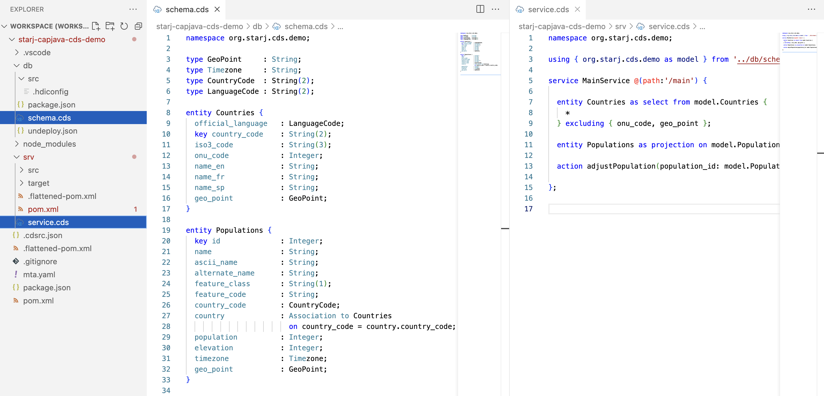 db/schema.cds에 Countries, Populations 두 entity를 작성하고, Populations의 country_code로 Countries에 assocation한다.
