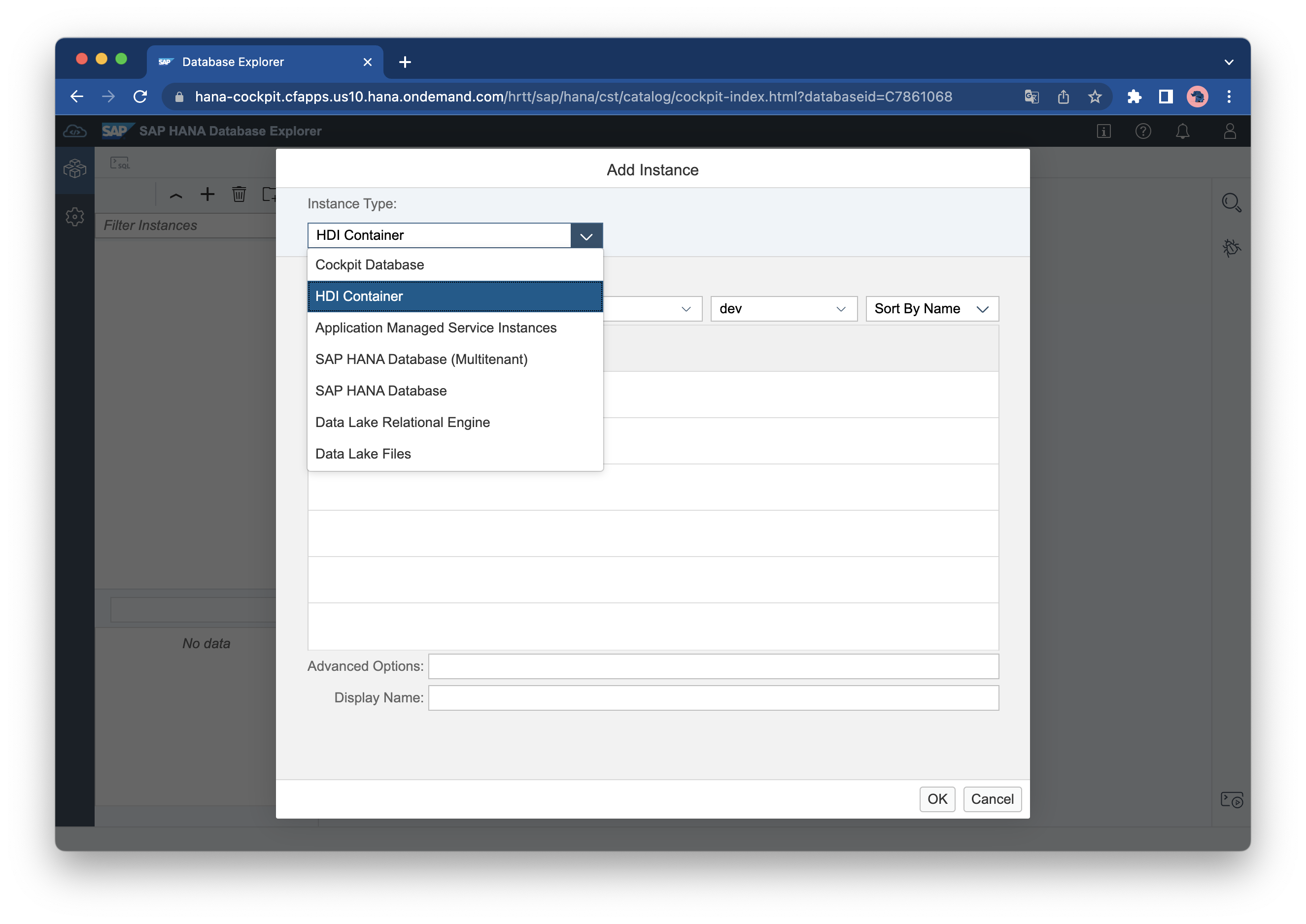 Instance Type을 HDI Container로 변경하면 BTP HANA Cloud DB에 배포된 모든 HDI Container들의 목록이 나타난다.