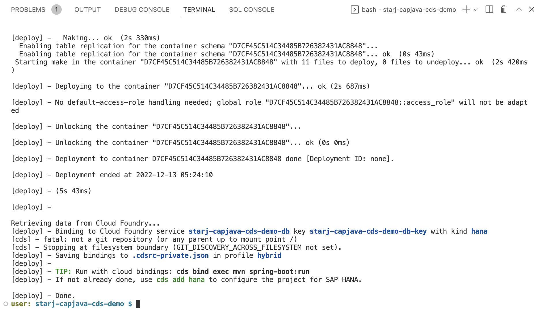cds deploy는 HANA DB에 이 CAP Java Application이 사용할 새로운 HDI Container를 생성하여 배포한다.