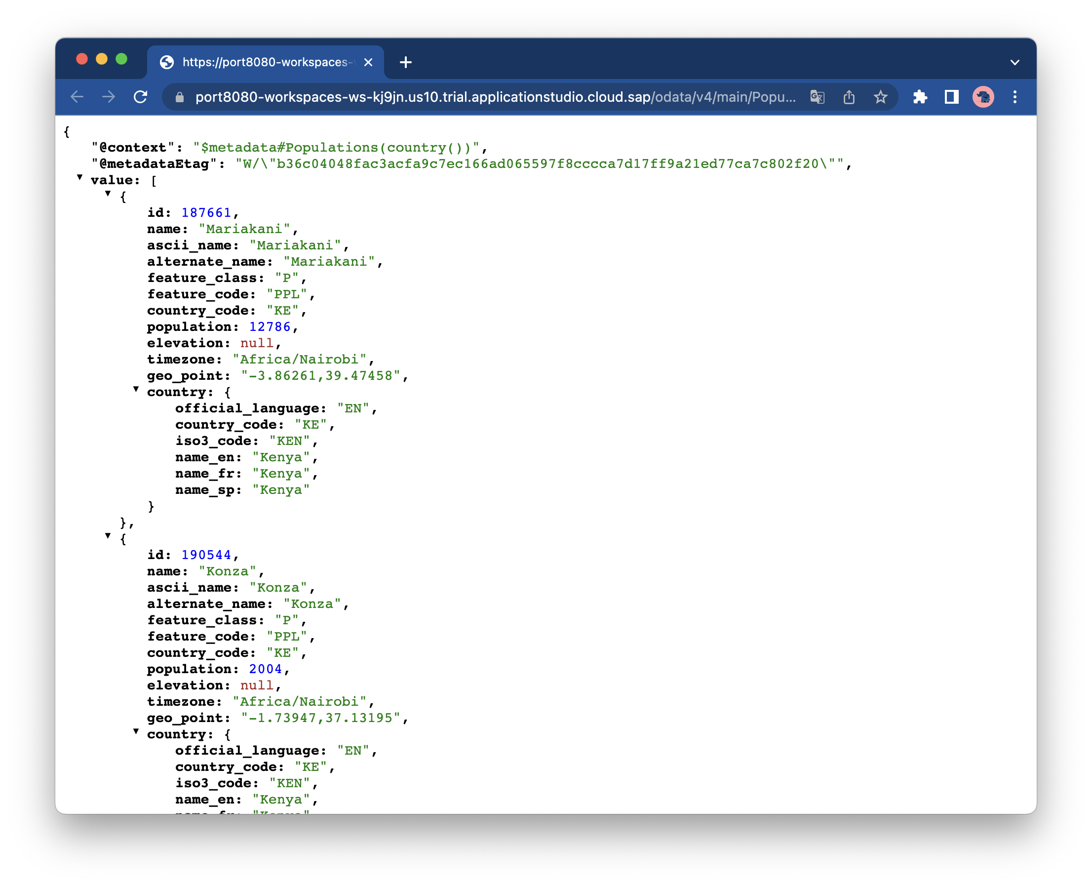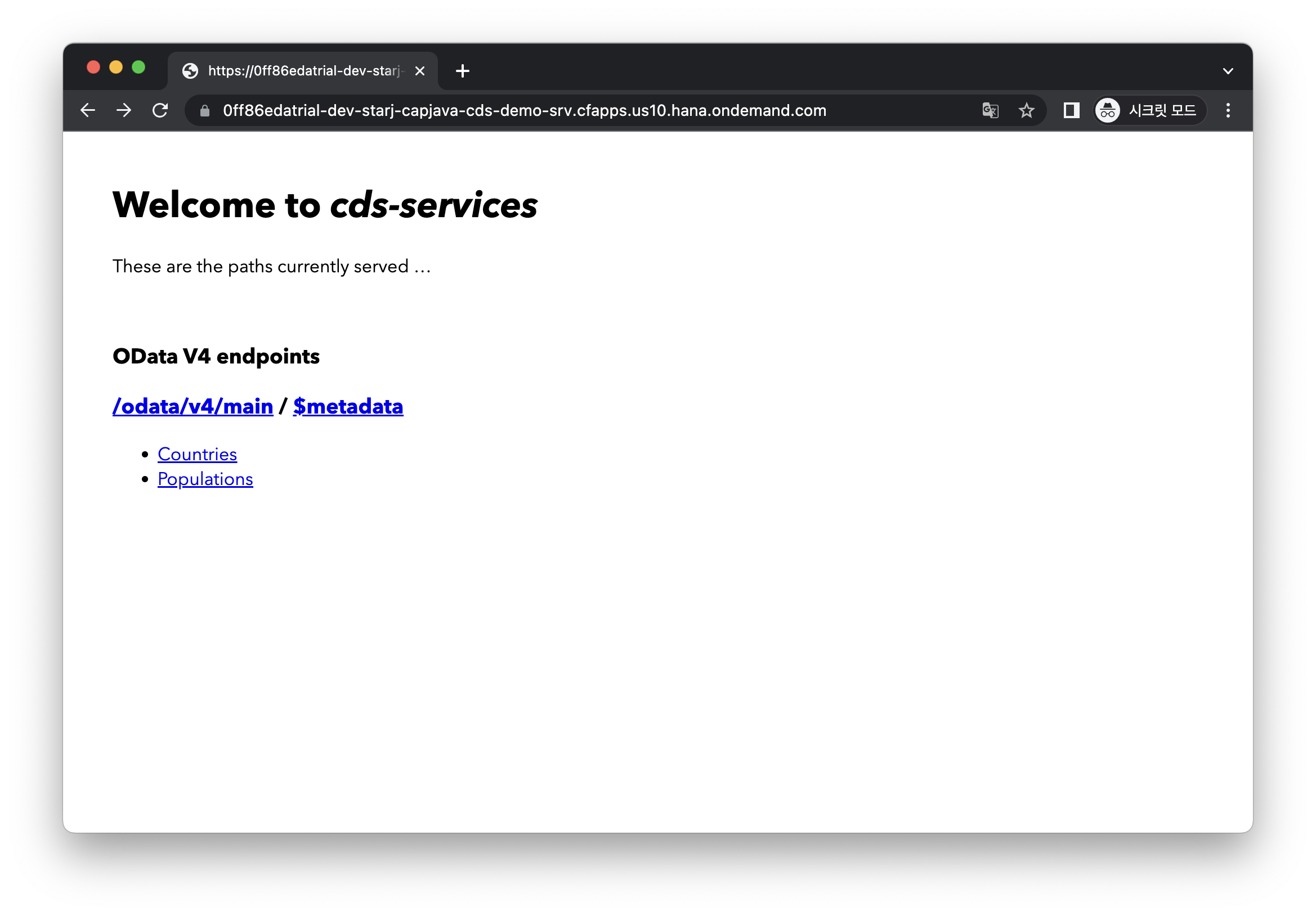 "Open in a New Tab" 버튼 클릭하여 OData $metadata와 main 서비스의 Countries, Populations 두 entity의 결과를 확인 할 수 있다.