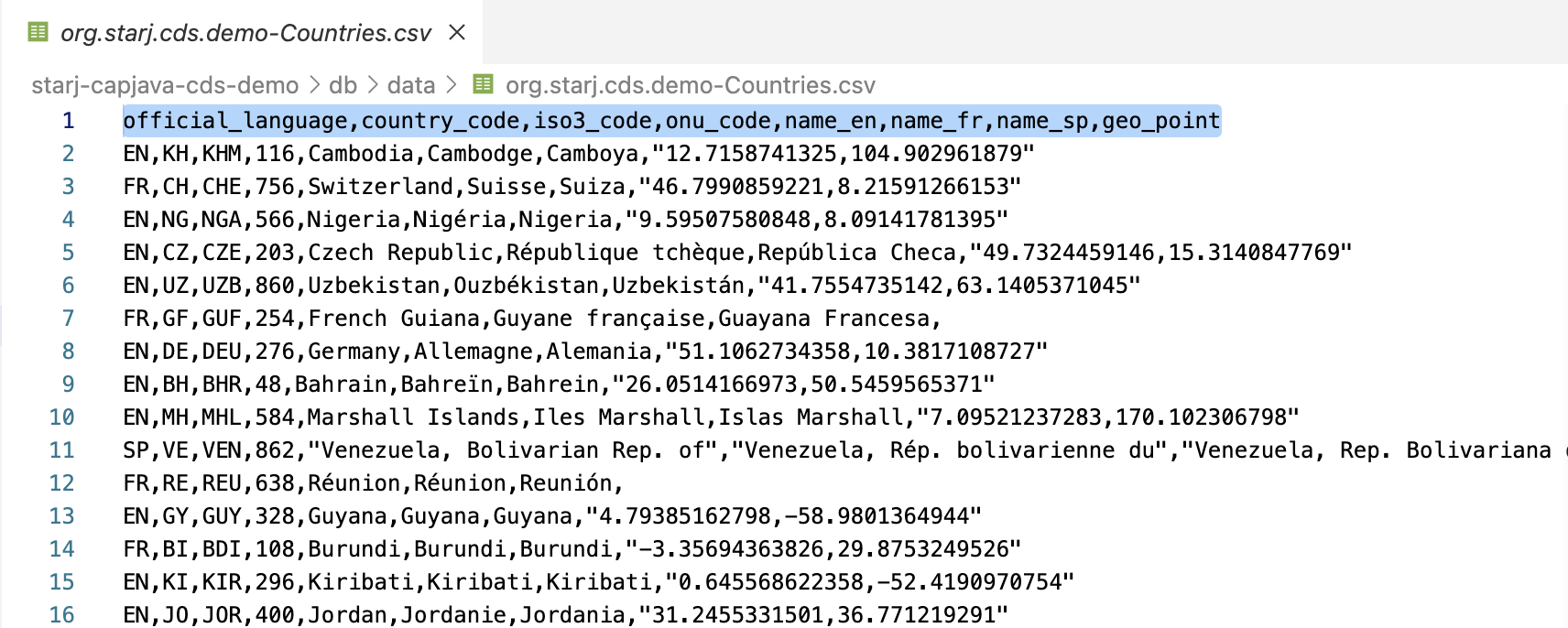 CDS 서비스 구동 시 schema.cds에 의해 만들어질 Countries, Populations 두 테이블에 기본 데이터를 채울 수 있다.