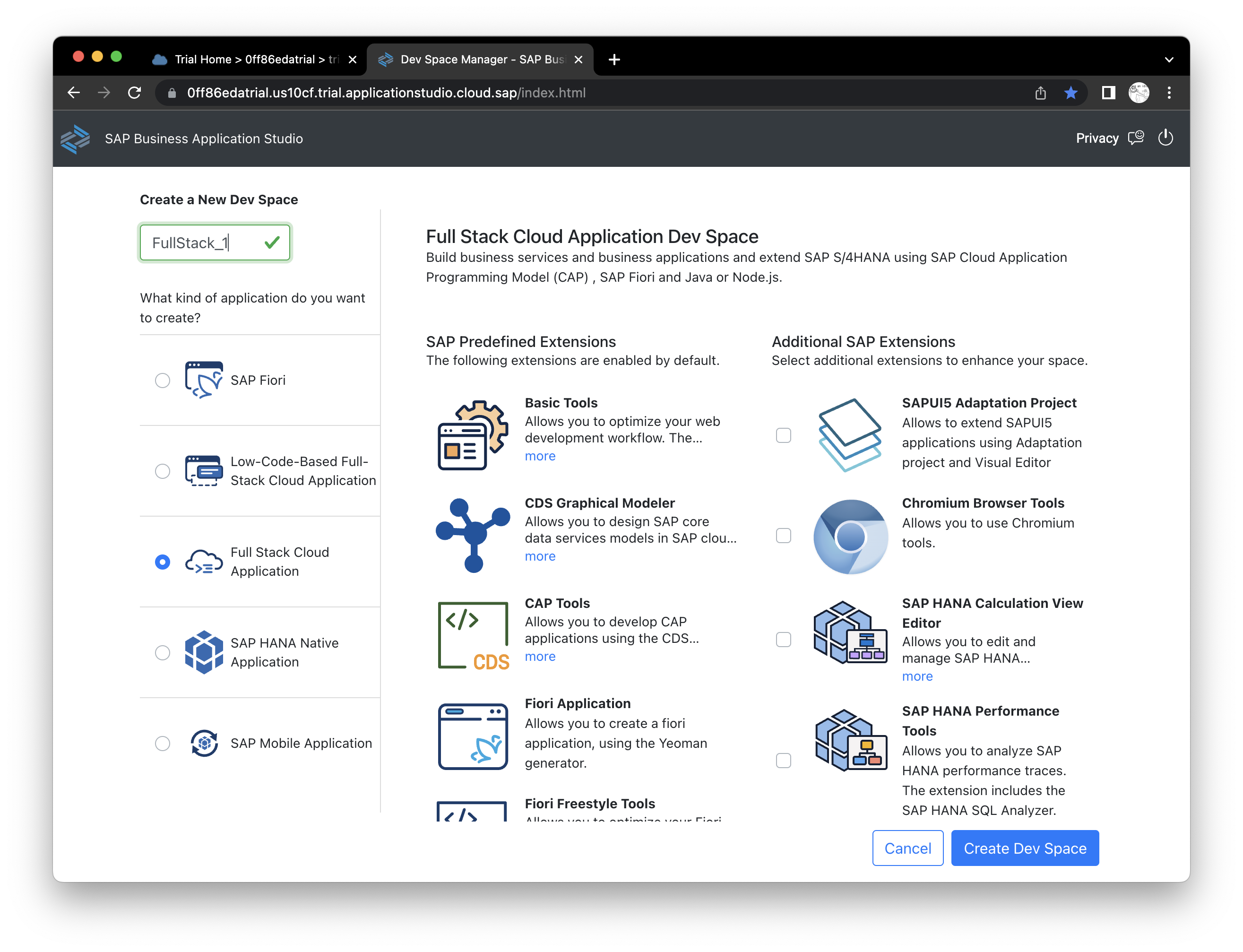 Full Stack Cloud Application을 선택하고 이 Dev Space를 구분 할 이름을 입력 한 후 "Create Dev Space" 클릭