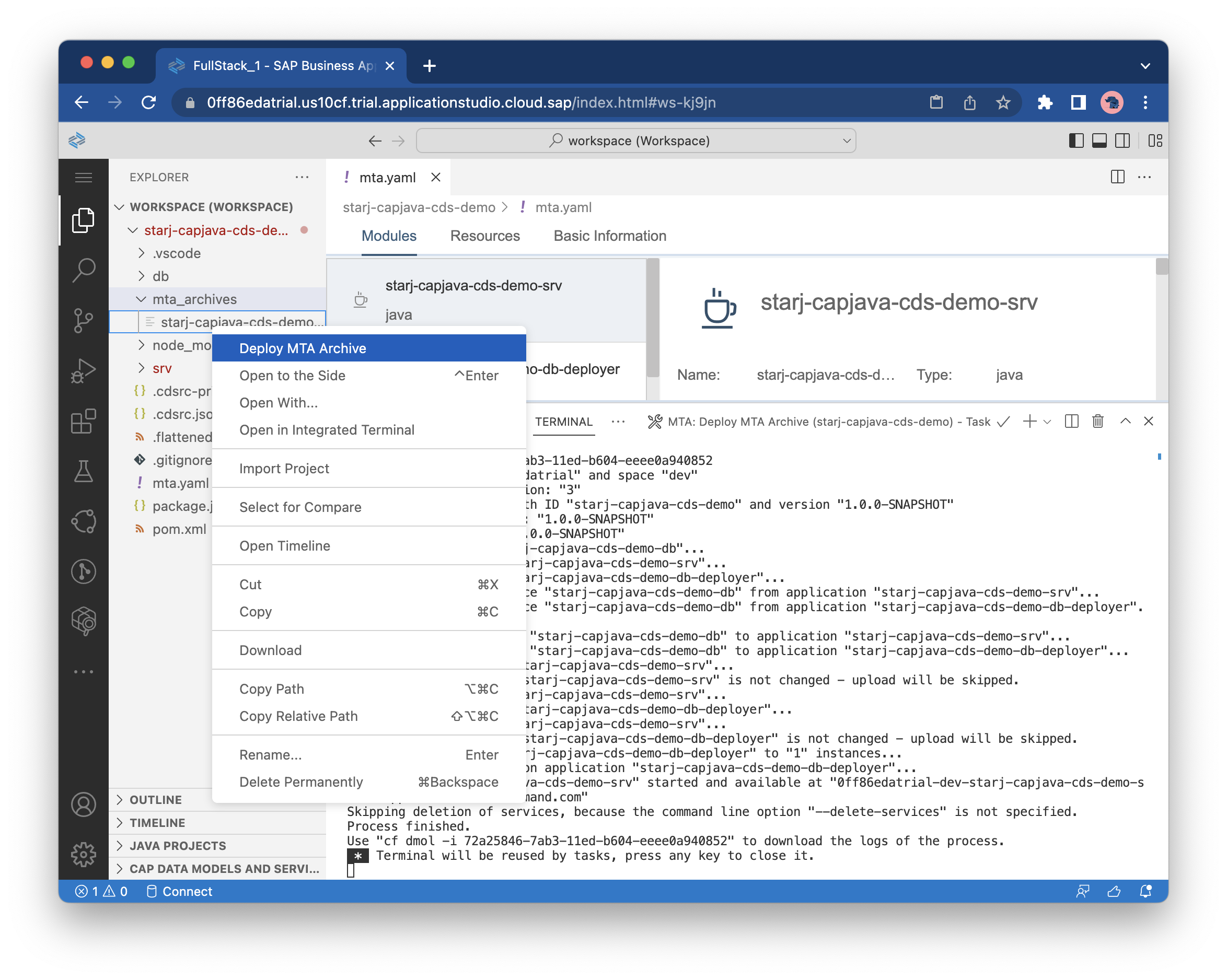 터미널에서 "cf deploy ./mta_archives/starj-capjava-cds-demo_1.0.0-SNAPSHOT.mtar" 명령을 실행 한 것과 동일하다.