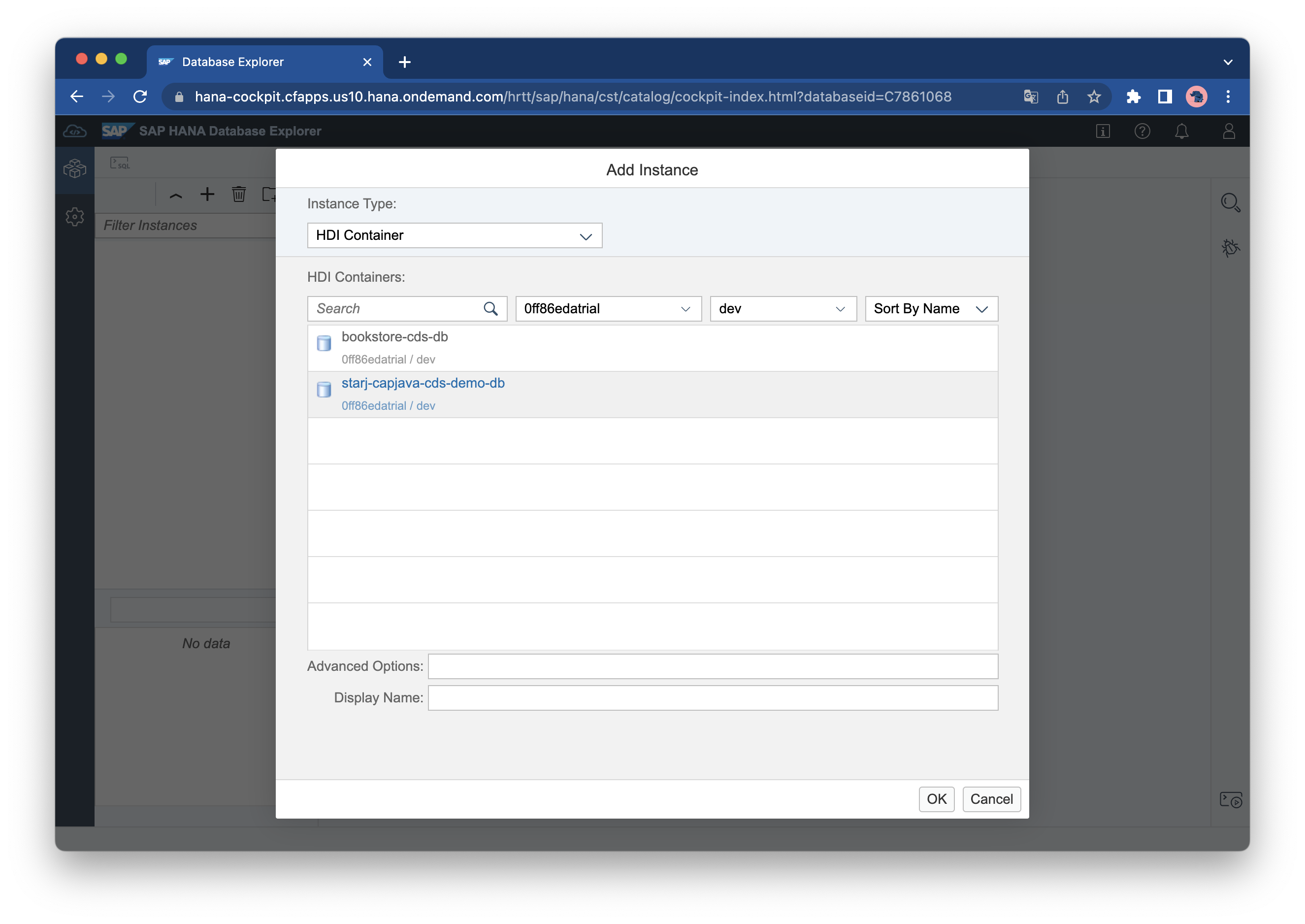 이중 배포한 HDI Container "starj-capjava-cds-demo-db"를 선택하고 "OK" 버튼을 클릭하여 추가한다.