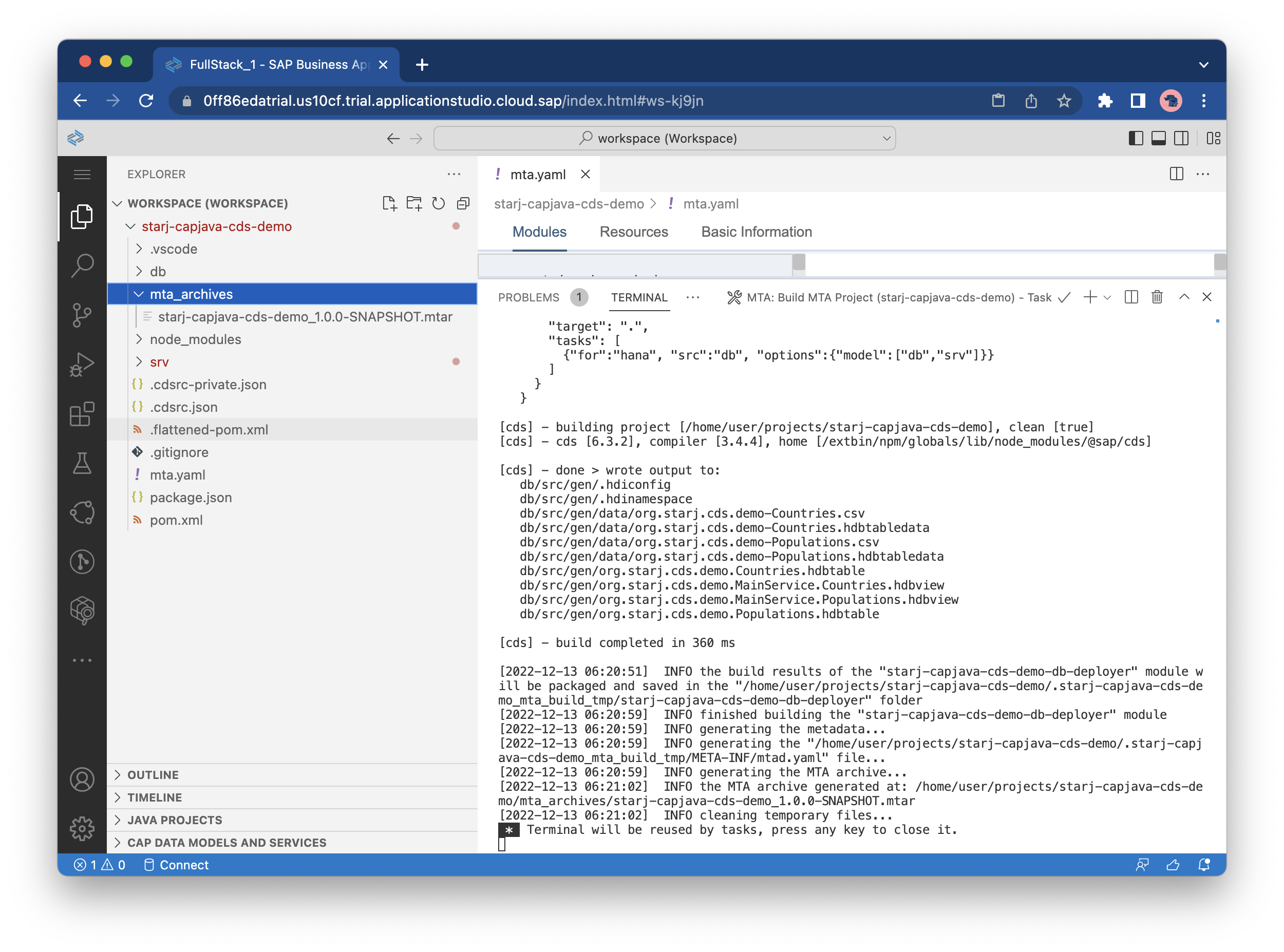 본 프로젝트 생성 시 함께 옵션으로 선택한 MTA(Multi Target Application)로 빌드하고 것이며 빌드 후 생성된 .mtar 파일을 배포한다.